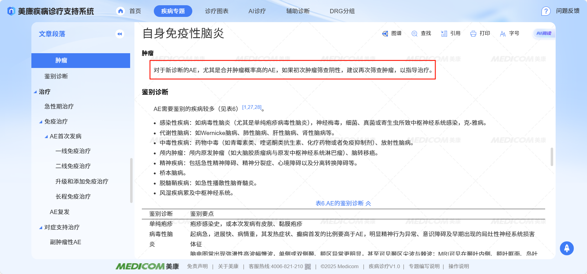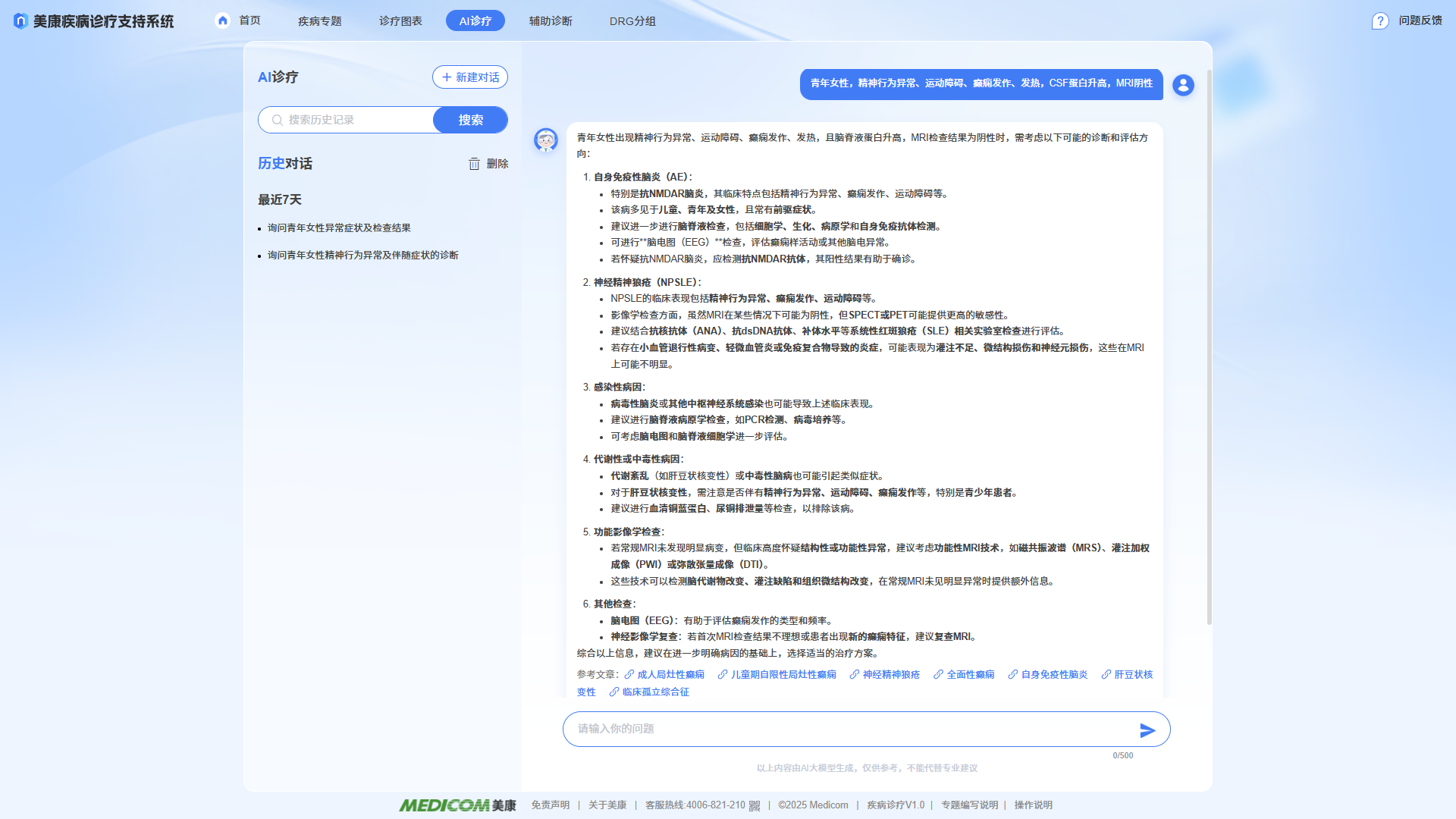 就诊期间,患者生命体征持续处于不稳定状态,病情进展迅速,后续的诊断与治疗工作已迫在眉睫。由于急诊科接诊医生在精神科、神经科疾病诊疗方面经验相对有限,在给出初步对症处理方案以维持患者基本生命体征稳定后,立即打开“疾病诊疗”ai检索,输入患者核心临床表现:青年女性,精神行为异常、运动障碍、癫痫发作、发热,csf蛋白升高,mri阴性,希望借助“疾病诊疗”辅助诊断方向。