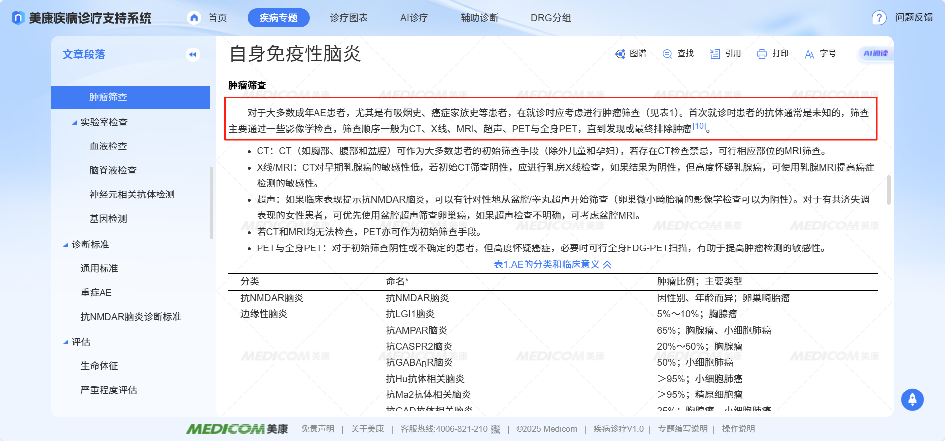 通过点击相应专题链接,获取指南、诊疗等信息,专题指出:对于大多数ae患者,尤其是有吸烟史、癌症家族史等患者,在就诊时应考虑进行肿瘤筛查。首次就诊时患者的抗体通常是未知的,筛查主要通过一些影像学检查,筛查顺序一般为ct、mri、超声、pet与全身pet,直到发现或最终排除肿瘤。
